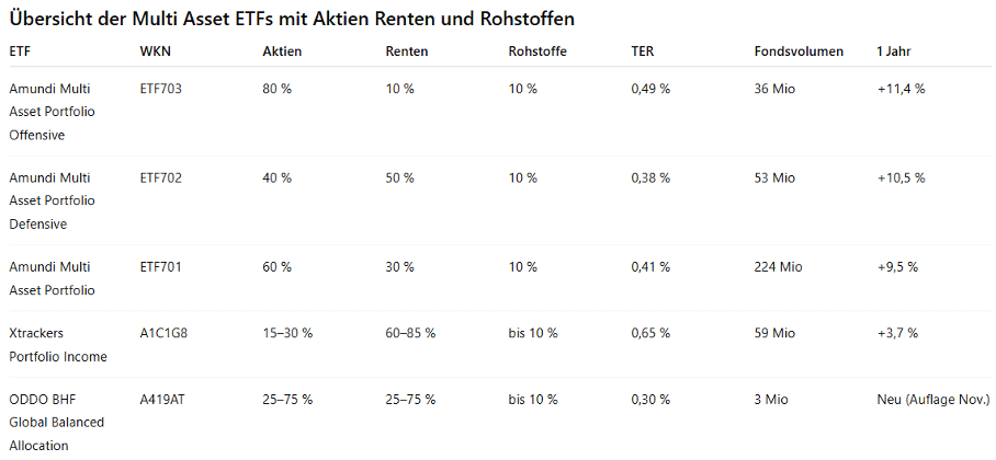 In diesem Report geht es ausschließlich um Multi Asset ETFs, oft auch Portfolio ETFs genannt, die in alle drei zentralen Bausteine Aktien, Renten und Rohstoffe investieren. Der Fokus liegt dabei auf Produkten, die meist aktiv gesteuert werden oder zumindest einer klaren strategischen Allokation folgen. Genau diese Kombination macht sie für viele Anleger besonders interessant, weil sie mehrere Anlageklassen in einem einzigen Produkt bündeln und damit einen strukturierten und breit diversifizierten Vermögensaufbau ermöglichen.