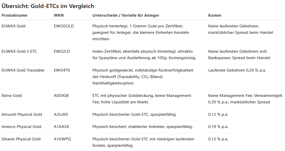 Alle Produkte sind physisch gedeckt, mit unterschiedlichen Kostenstrukturen und Optionen für Nachhaltigkeit bzw. Herkunfts-Nachweis. Die Kostenangaben beziehen sich auf laufende Produktgebühren, Handelskosten können zusätzlich je nach Depot-Anbieter anfallen.