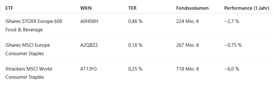 Stattdessen führen die Wege über angrenzende Bereiche. Geeignete Alternativen finden sich vor allem bei ETFs aus dem Segment Food & Beverage oder im klassischen Bereich der sogenannten Consumer Staples. In diesen ETFs sind die großen Getränke-Konzerne häufig mit enthalten, allerdings eingebettet in ein breiteres Umfeld aus Nahrungsmittel- und Konsumgüterherstellern. Wer diesen Weg wählt, setzt weniger auf einen einzelnen Trend, sondern auf die Stabilität eines ganzen Konsumbereichs, mit allen Chancen, aber auch mit der Verwässerung, die eine breitere Streuung zwangsläufig mit sich bringt.