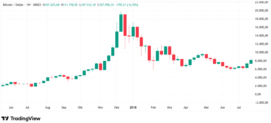 Ein klassisches Beispiel ist der Bitcoin-Höhenflug Ende 2017/Anfang 2018, als der Kurs von ~10.000 US-Dollar auf fast 20.000 US-Dollar schoss und dann innerhalb weniger Wochen auf ~6.000 US-Dollar einbrach.
